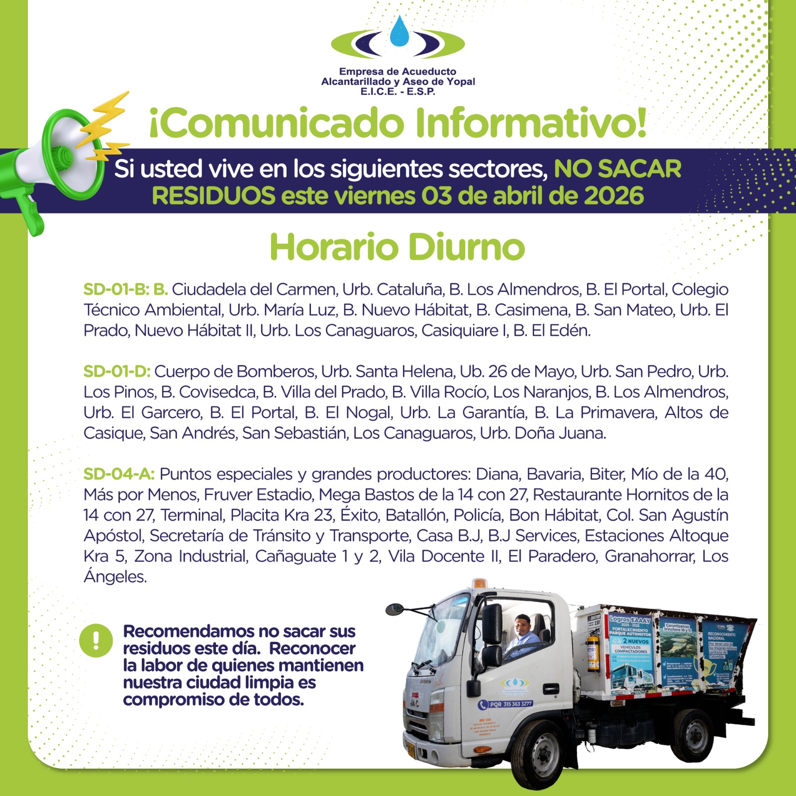 ♻️ Este viernes 03 de abril de 2026 se realizará la modificación del esquema operativo en la prestación del servicio de recolección y transporte de residuos sólidos domiciliarios en el municipio de Yopal.