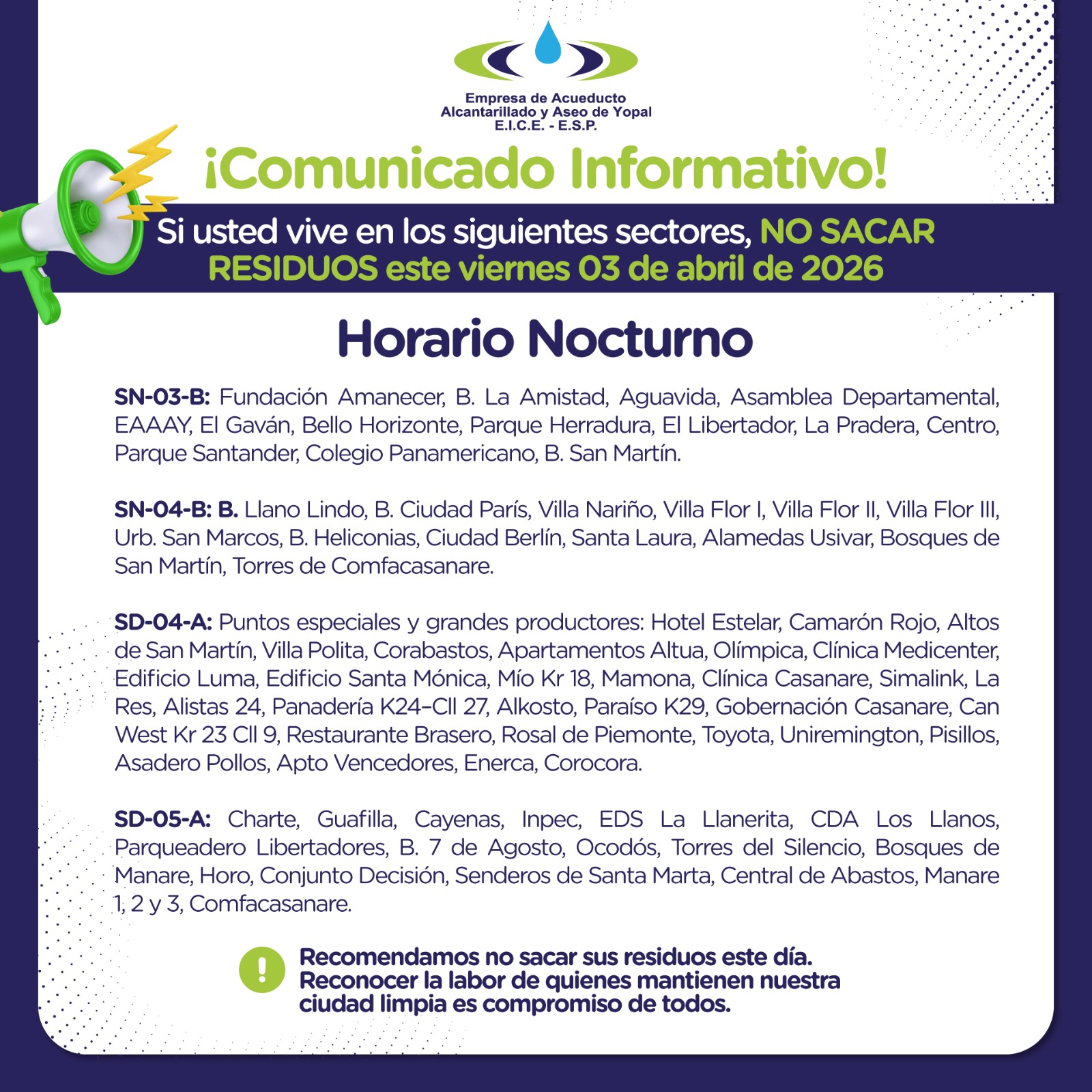 ♻️ Este viernes 03 de abril de 2026 se realizará la modificación del esquema operativo en la prestación del servicio de recolección y transporte de residuos sólidos domiciliarios en el municipio de Yopal.